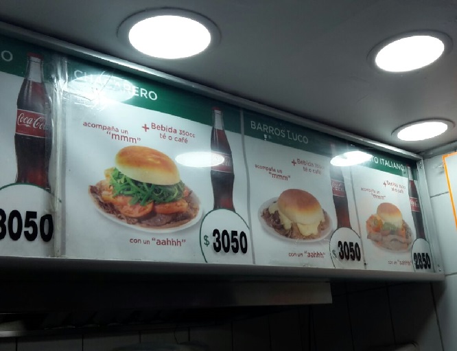 El precio del Barros Luco en la Plaza de armas de Santiago de Chile es de 3050 pesos chilenos gaseosa incluída, es decir al cambio de hoy unos 4,43 USD, y se puede pagar con tarjeta.