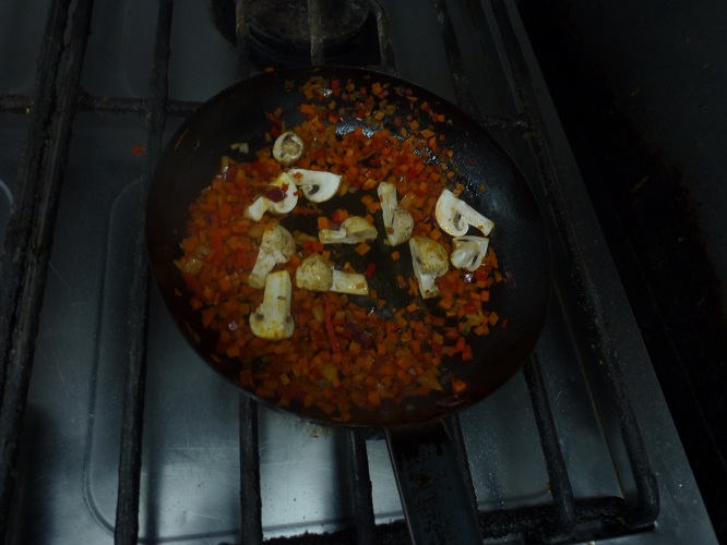 Ahora vamos al fuego. Ponemos a rehogar las verduras y unos minutos después agregamos unas gotas de vino blanco…