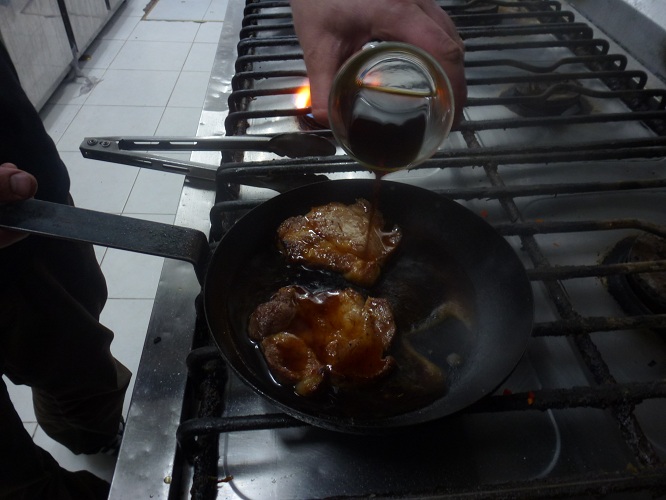 Una vez sellada la bondiola en ambas caras agregamos un vaso de cerveza negra y azúcar negra. Desde ahora es importante que estemos constantemente echando con una cuchara el líquido sobre la carne mientras reduce hasta lograr una salsa espesa.