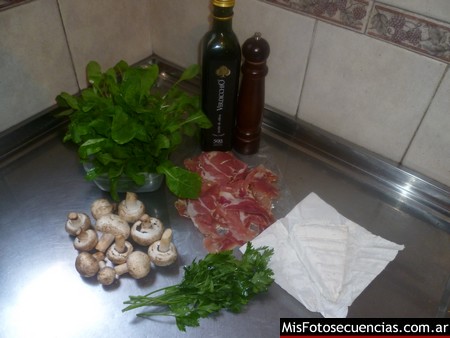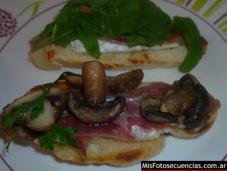 … y seguimos a gusto. En este caso agregué por un dato jamón crudo, los champiñones y una pizca de pimienta. Por el otro, jamón crudo, rúcula, oliva y algunas nueces.