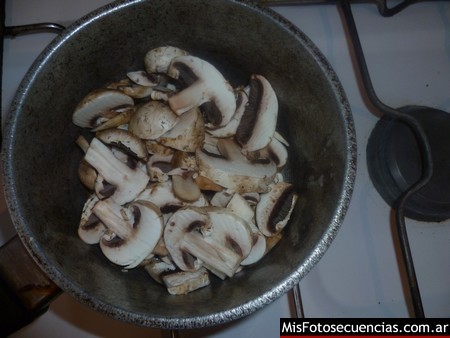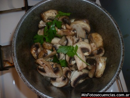 … y agregamos los champiñones cortados. Los salteamos apenas uno o dos minutos…