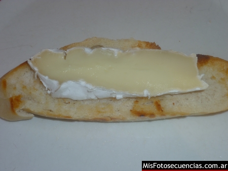 Una vez tostados los panes (es recomendale frotar con ajos, que en este caso no tenía) agregamos una porción de queso brie…