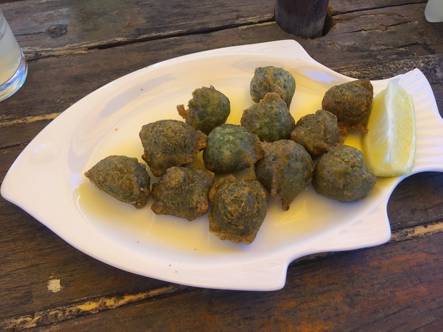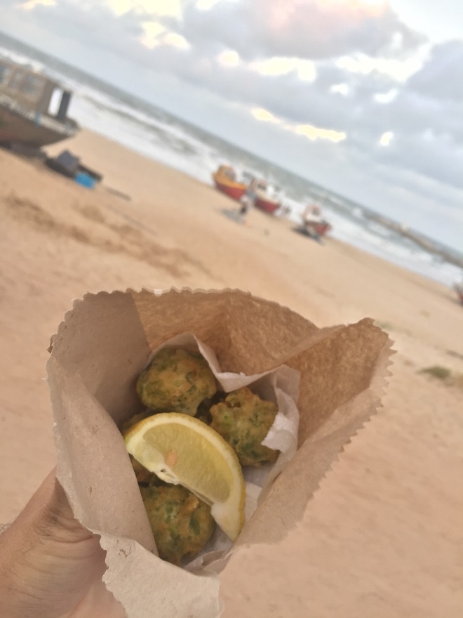 Encontré carteles ofreciendo buñuelos de algas en todo el pueblo, los compré frente a la playa de los pescadores.