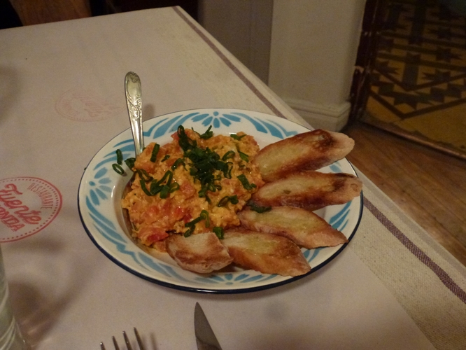 La entrada fue «Tomaticán cuyano con tostadas de pan casero» ($42), un revuelto de tomate con tal o cual ingrediente más o menos pero todos coinciden en el punto de que es algo típico de madres mendocinas, según pude comprender.