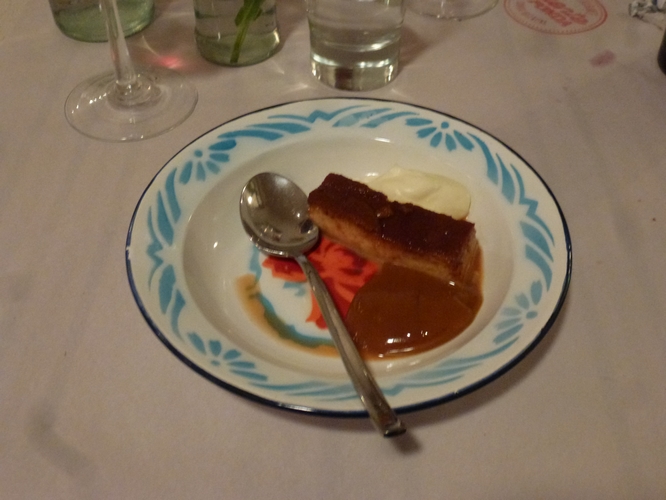 El postre, fuera de programa y cortesía de la casa según reza la carta, fue Flan con dulce de leche y crema que se mantuvo al nivel de los pasos anteriores. Esta vez no hubo café para el cierre, solo un aprentón de mano a Pablo del Río y a dormir que al otro día el despertador castiga temprano.