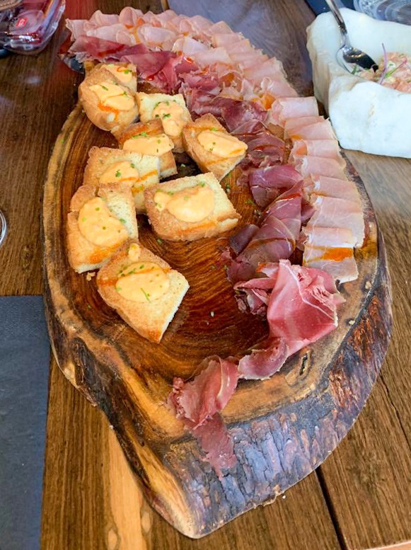 Tabla de jamón crudo de jabalí y ciervo con tostadas de focacia y tomates – $375