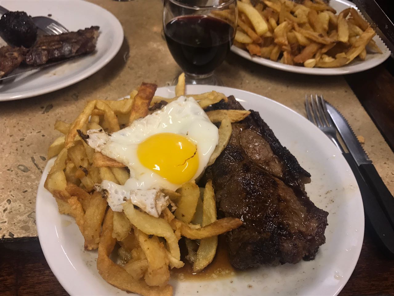 El bife de chorizo vino acompañado de papas fritas y huevo frito con la yema en un punto justo para romper con un pancito y untar. Una porción generosa aunque el bife estuvo un tanto seco para mi gusto. El vino de la casa es Toro con soda y hielo pero nos inclinamos por un Alma Mora.