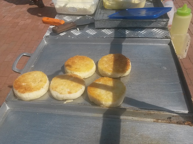 Lo primero que probamos fue arepa que es una tortilla elaborada con harina de maíz, de forma circular y unos 2 o 3 centímetros de alto, se cocina con manteca. Las arepas se sirve dorada por fuera rellena de queso. Las preparan en casi todas las esquinas y es algo bien típico de la cocina colombiana.