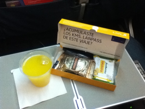 Ahora si camino a casa, la gente de LAN volvió a servir desayuno pero solo pedí jugo de naranja y una cajita con alfajor, brownie y unas almendras muy ricas.