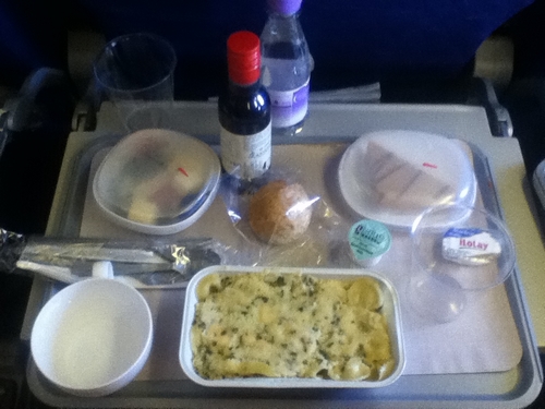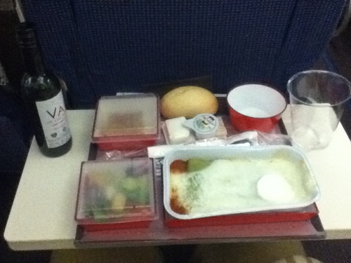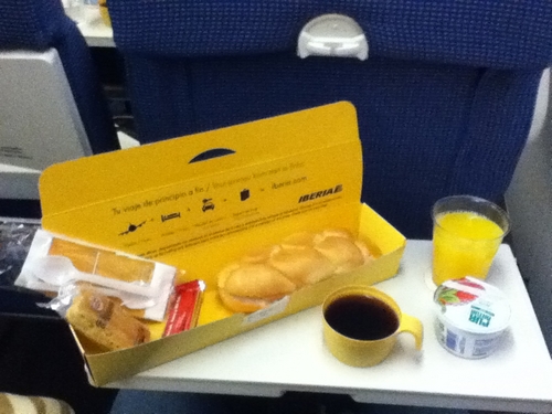 Nuevamente Iberia entre lo más pobre del viaje en materia de meriendas. Esta vez también se podía elegir y entre Albondigas y Lasagna me incliné por la última. Previa entrada de hojas verdes, probé la lasagna que realmente no tenía sabor alguno. Por supuesto comí todo y me tiré a dormir hasta que me avisaron que estaba el desayuno a disposición.