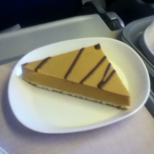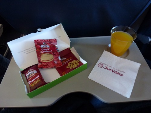 Ya sobrevolando mi país y con destino a la última escala del viaje sirvieron el desayuno: café (o té) con un sandwich y tortita, más jugo de naranja y yogurth.