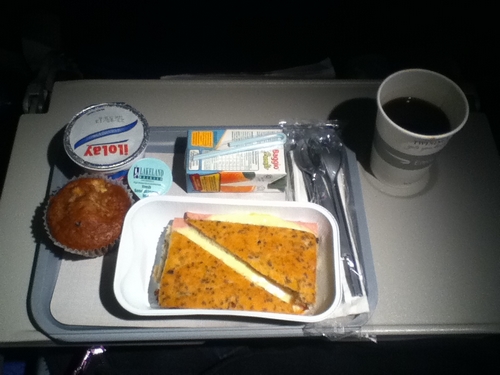 Ya sobrevolando mi país y con destino a la última escala del viaje sirvieron el desayuno: café (o té) con un sandwich y tortita, más jugo de naranja y yogurth.