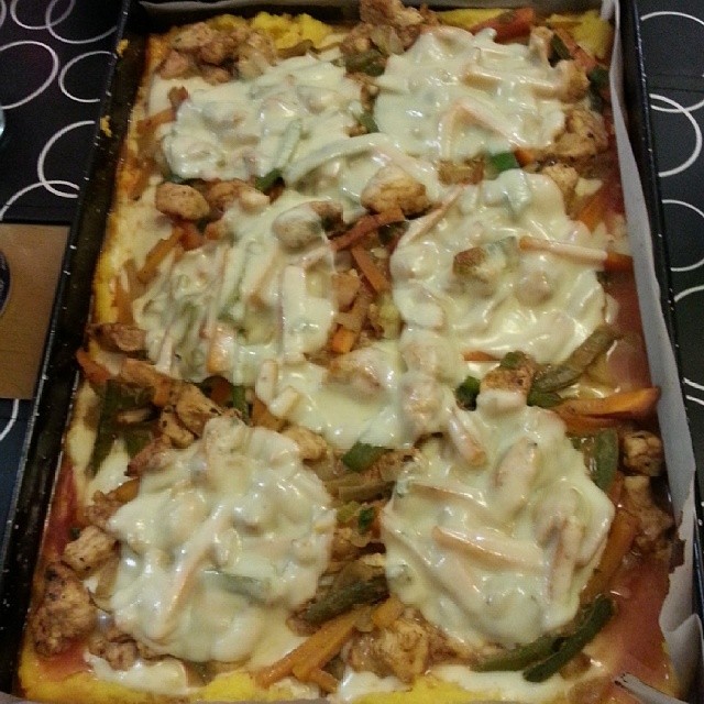 Polenta a la pizza: el topping. Verduras: cebolla, morrón y zanahoria en palitos finos. Aceite al wok y saltear. Después pollo en bocaditos chicos y cebolla de verdeo. Le agregué salsa de soja, perejil y un poco de queso crema al final. También nuez moscada.