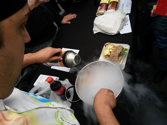 Este post se crea sin intención alguna de entrar en el debate de que es molecular y que no, si nos gusta o no lo molecular y la mar en coche. Lo cierto es que el Choripán molecular de Inocencio Urbano lleva merengue de chimichurri con albumina en polvo y oxido nitroso, picante para inyectar al pan (o aplicar en gotas según prefiera el comensal) y nitrógeno líquido para cristalizar verduras y darle una sensación de calor y frío en cada bocado. Pero mejor escuchemos a su creador: