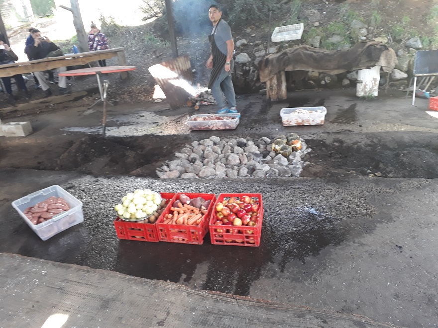 Para el curanto se usa todo tipo de carnes, frutas y verduras. En este caso usaron chorizos, pollo, cordero, nalga, zapallo, cebolla, zanahoria, batata y manzanas entre otras.