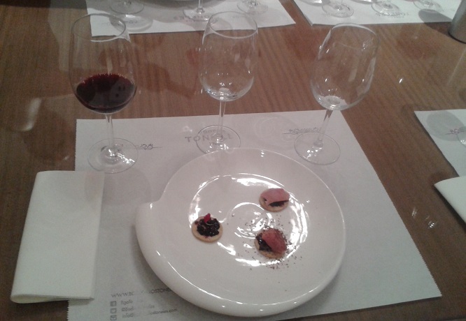 En la sala de cata nos esperaba una mesa con tres copas y un plato con bocadillos que acompañaron los vinos. En este caso se trató de la Degustación Malbec que se compone de Tonel 22 Malbec acompañado de Crocante de manteca y mermelada de frutos rojos, Tonel 46 Malbec con Lomo de cerdo ahumado sobre crocante de manteca y mermelada de frutos rojos y Tonel 137 Malbec con Lomo de cerdo ahumado sobre crocante de manteca, mermelada de frutos rojos y una pizca chocolate negro rallado. Sin ser un experto en vinos y sin intención de entrar a hilar muy fino digo que simplemente me parecieron buenos los que probamos y sobre todo que estuvo muy bien elegidos los acompañamientos. No fue una cena por lo que las porciones eran solo para interpretar los sabores y no «para llenarse». El tiempo estimado para el recorrido más cata fue de unos 45 minutos y está a solo 10 minutos del centro por lo que es una opción ideal para gente como yo que viene a Mendoza por trabajo y dispone de poco tiempo libre para el esparcimiento.