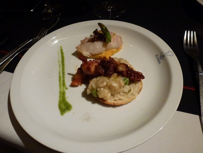 - Risotto de puerro y arvejas y pulpo salteados con tomates secos,