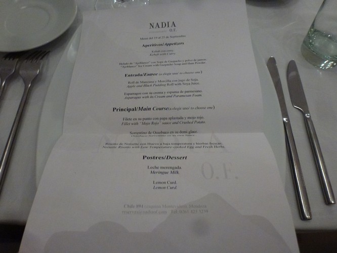 La carta del restaurante no está publicada pero se envía por correo a quién la solicite. Esto es debido a la dinámica de cambiarla todas las semanas y a que prefieren mantener el factor sorpresa en sus comensales. Visité Nadia O.F. a fines de septiembre, el menú de esa semana fue: