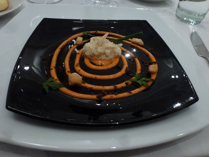 Helado de «Ajoblanco» con sopa de Gazpacho y polvo de jamón