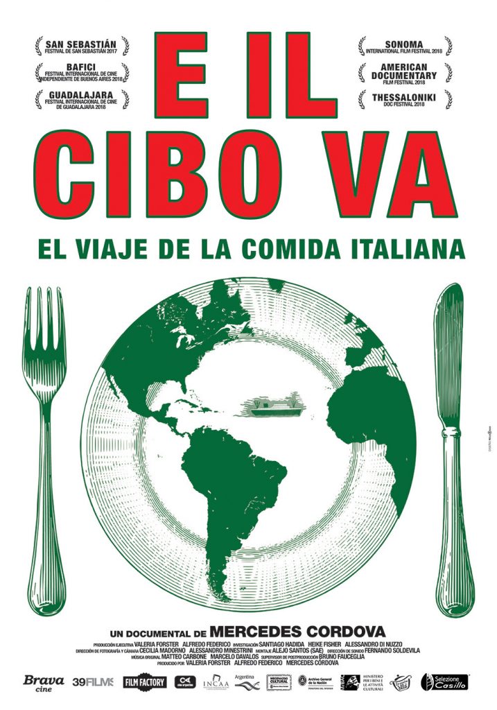 E il cibo va es un documental dirigido por Mercedes Cordova que trata sobre la migración italiana y el impacto de su gastronomía tras el fenómeno migratorio principalmente en Nueva York y Buenos Aires.