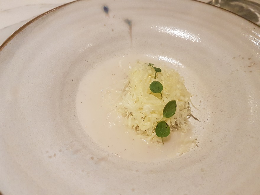 Capelina de algarroba con cremoso de peperina y salsa y dientes de granada