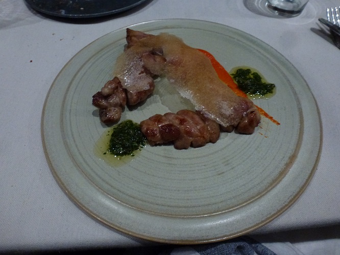 La carta es escueta, no vi opción de menú degustación (no me pregunten por qué, pero creí que tendrían), cuatro entradas, cuatro principales (Pollo, Vaca, Verduras y Pescado) y tres postres. Pedimos un vino malbec Petit Fleur ($195) de Bodega Monteviejo mientras leímos la carta y probamos chipa, salame y zanahorias deshidratadas con una crema de cilantro y cacao. Luego unas rodajas de pan con manteca ahumada con madera de manzana y sauce para dar paso a la cena que en mi caso arrancó con una Mollejas asadas, pimientos, gremolatta y limón crocante ($95) (Tip: lo realizan ahumando el limón, luego se procesa completo y se mezcla con fécula de mandioca para luego pasar por la deshidratadora). El principal fue Bife de chorizo a las brasas, papas cremosas, lengua a la vinagreta y berenjenas ($210) que también estuvo muy bien. Para despejar dudas en la mesa pedimos 3 puntos de cocción distintos y que fueron servidos de manera correcta. Al momento del postre pedimos un nuevo vino, Laborum rosado de malbec de Bodega El Porvenir ($165) y los tres postres de la carta Torta en Sartén, ciruela, helado de vainilla ahumada y miel, y leche crocante ($80), Tereré($80) que no es la infusión norteña sino un postre con crema de yerba mate y en mi caso Chocolate y Maní ($80). Todos muy buenos acompañando el nivel anterior aunque a mi juicio la vedette fue el Tereré.