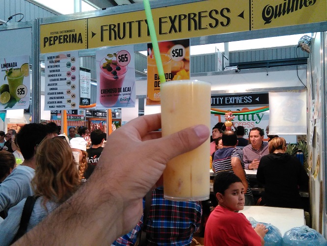 Dado que las rutas de Córdoba fijan por Ley la tolerancia cero al alcohol en sangre del conductor y yo debía manejar de regreso a mi hogar me incliné por los jugos de frutas a la hora de elegir la bebida y no por algunas de las cervezas artesanales que ofrecían. El jugo que tomé lo compré en el stand Frutty Express, fue de mango con leche de coco y costó $50. El stand también vendía jugos de otras frutas y a diferentes precios.