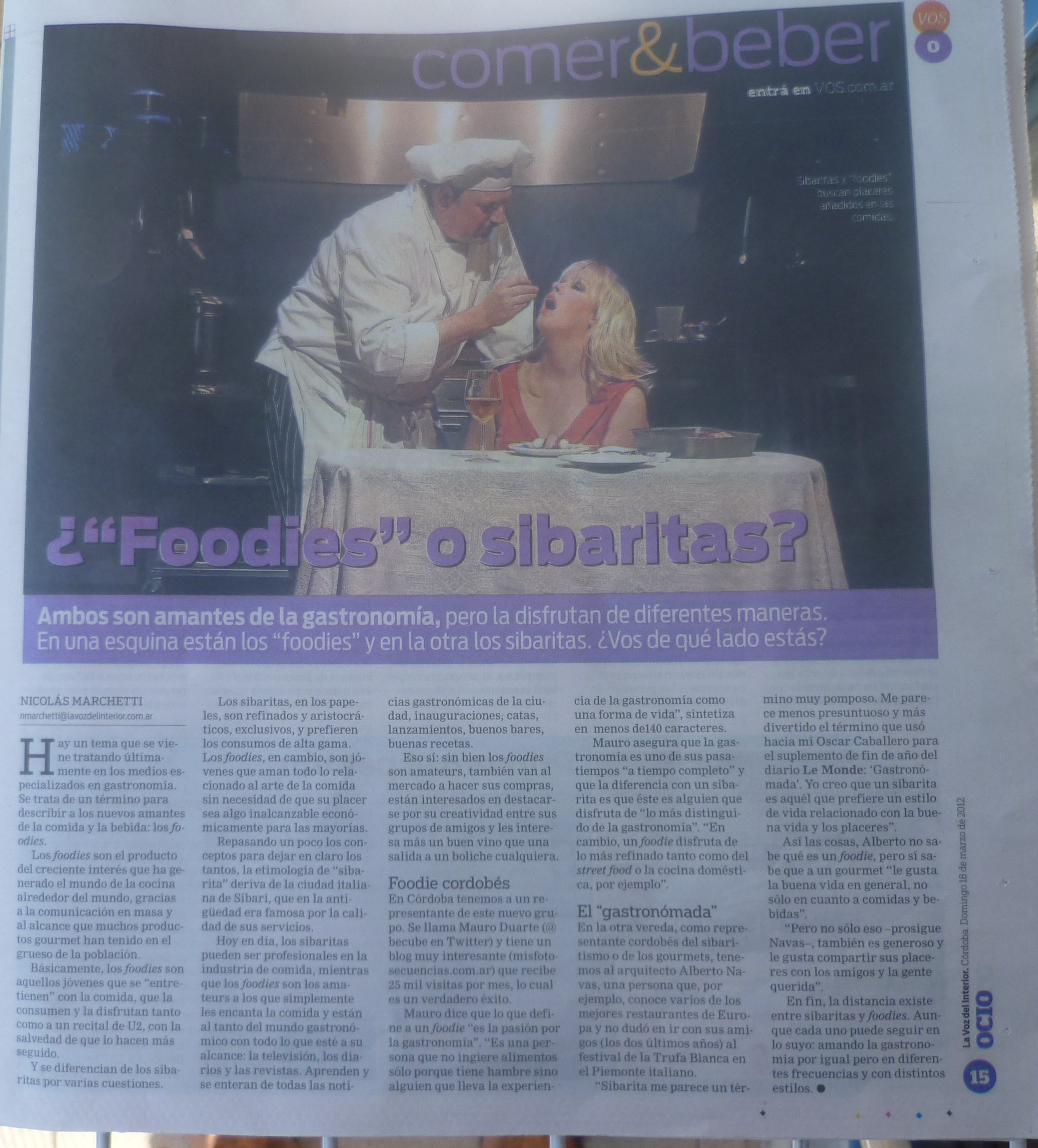 ¿»Foodies» o Sibaritas? es el nombre de la nota en la sección «Comer & Beber» de este domingo en el diario La Voz del Interior. La nota, como todos los domingos, estuvo a cargo de Nicolás Marchetti pero con la particularidad de que esta vez tuve la suerte de colaborar respondiendo unas preguntitas.