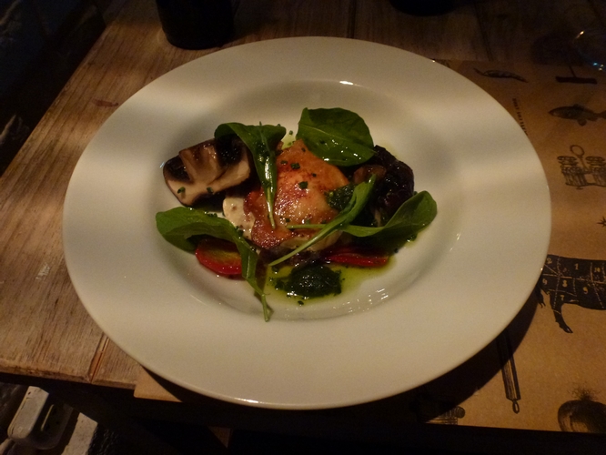 La entrada fue Queso de cabra relleno[$65], crotin relleno acompañado de portobelo asado, cherrys secos y salsa verde que estuvo majestuoso. La sola presencia de este plato ya justifica la espera, el viaje hasta zona norte y todas las trabas en el camino.