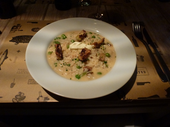De nuevo irrumpió en escena el mozo buena onda para cambiar los cubiertos y preparar la cancha para el plato principal: RG[$125], risotto de guisantes con zuquini quemado y mascarpones que estuvo bien. Un tanto salado para mi gusto, al igual que el paté de pollo, lo que hace que uno deba encarar furiosas embestidas contra la copa de vino. Seguramente de balancear la cantidad de sal en la preparación hoy estaría aplaudiendo de pie porque el restos de los sabores estuvieron muy bien y el zuquini quemado daba un sabor especial colocando al plato por encima de la media.