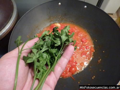 … agregamos dos dientes de ajos cortados a la mitad [Tip: conviene dejar los ajos grandes para luego poder retirarlos], un poco de perejil fresco, sal, una pizca de azúcar, pimienta y vemor como la salsa ya va tomando forma…