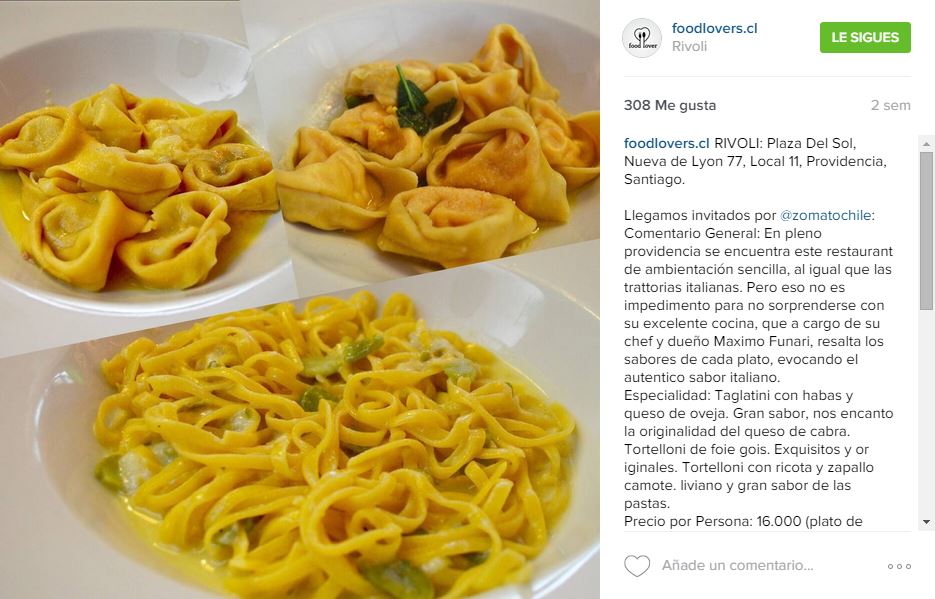 En las últimas semanas, y por un tema estrictamente personal, estuve mirando cuestiones que tengan que ver con Chile donde encontré algunos ejemplos de lo que les mencionaba recién. No es que en Argentina no tengamos buenos usuarios sino que al menos yo no encontré alguna cuenta que se dedique a escribir reseñas de restaurantes y lo haga de forma interesante. Les muestro tres ejemplos chilenos: