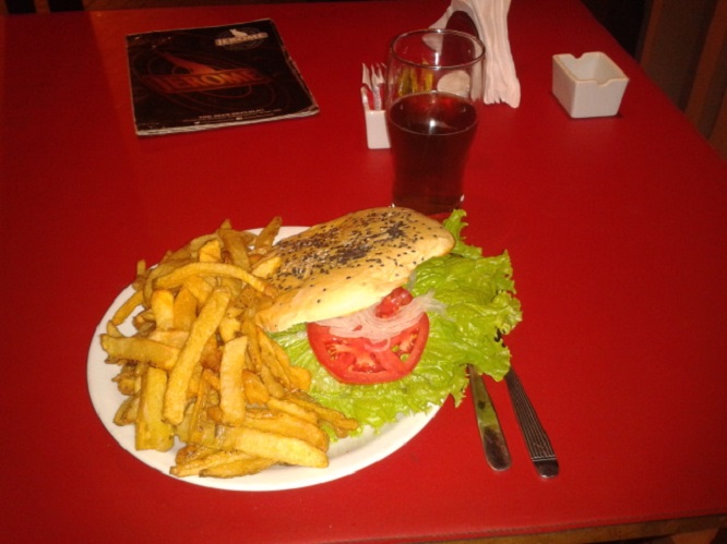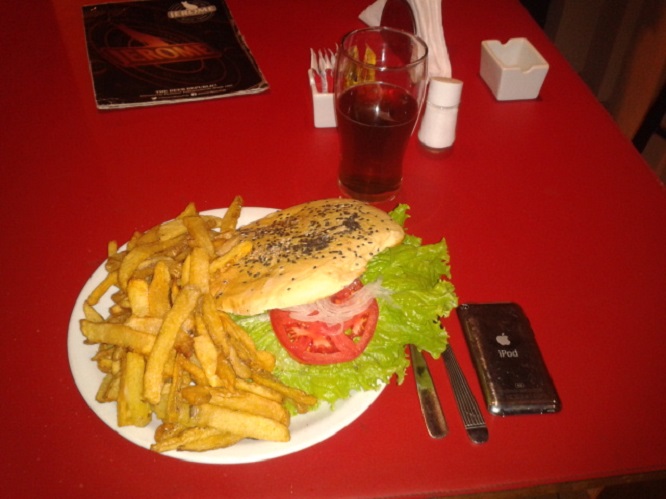 Lo cierto es que luego de toda una mañana de trabajar en Córdoba, un viaje en avión, una tarde de laburar en Mendoza y una nochecita de mandar mails desde una mesita incómoda de hotel… no había comido nada más que el desayuno, algunas mentitas y no recuerdo si algo más. Ni siquiera un mate, ni un misero mate. Pues, algo tenía que comer y que mejor que algo desafiante como «la famosa hamburguesa casera del Fundador de la Cervecería Jerome«.