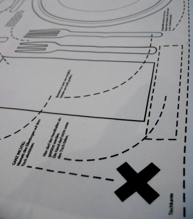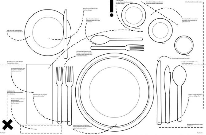 Kniggerich es un simpático mantel individual que permite, además de su función natural, enseñar cual es el comportamiento que debemos tener en la mesa, el orden de los utensilios y los movimientos de cada uno.