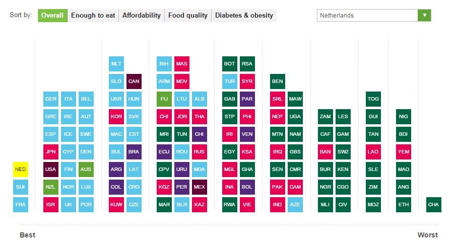 El índice general que mide la calidad de la comida ubica a Holanda (1), Suiza (2) y Francia (3) en los primeros lugares al tiempo que coloca a Italia en el 8°, España en el 13°, Brasil en el 25°, Argentina en el 36°, Chile en el 44° y al final de la tabla general se encuentra la República de Chad, un pequeño país del África central.
