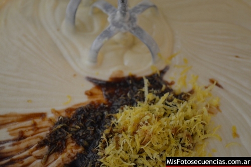 Agregar la harina en tres veces, alternando con el agua, batiendo bien cada vez que agregamos. Agregar la vainilla y la ralladura, batir.