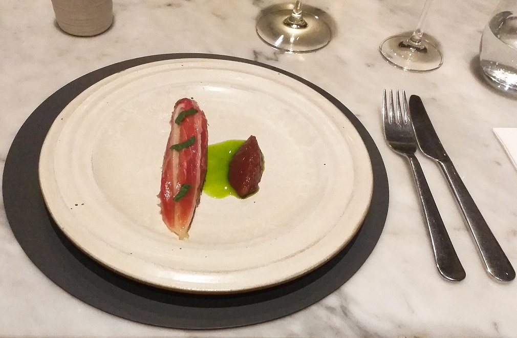 Jamon de pato, berenjena escabechada, mermelada de tomate y aceite de perejil