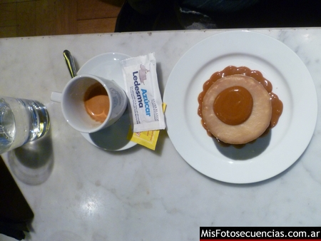 Según rezaba la carta, a la que finalmente pude acceder, el Ristretto es «intenso y presistente. De cuerpo denso, sin leche que lo convierte en una crema densa y suave. Compuesto exclusivamente por Arábicas de América del Sur.» Como se puede ver en la foto, es un shot de café arrollador. Lo acompañé con un algo que nunca sabremos su nombre pero que tuvo un marcado sabor a coco y visiblemente decorado con dulce de leche.