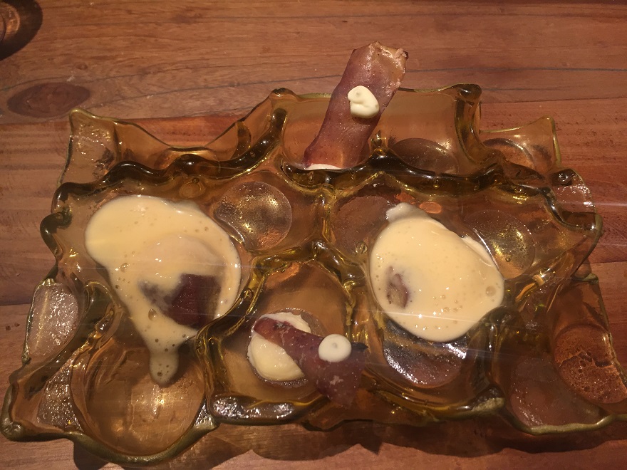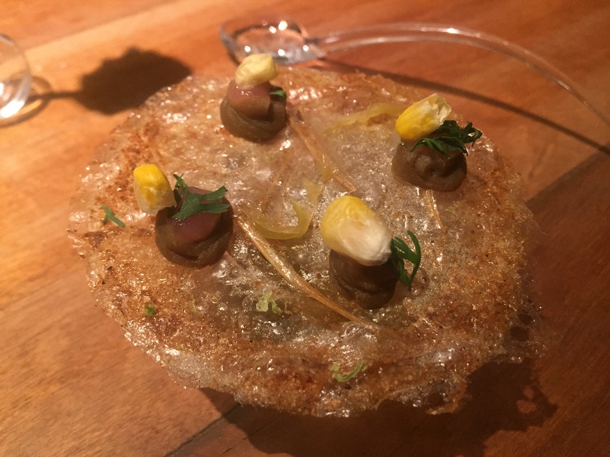 El primero de los principales vino desdoblado en callos del besugo (vejiga natatoria) con crema de kimchi, jugos de las cabezas, crema de berenjena ahumada, espinas encevichadas.