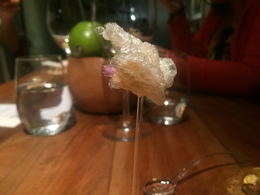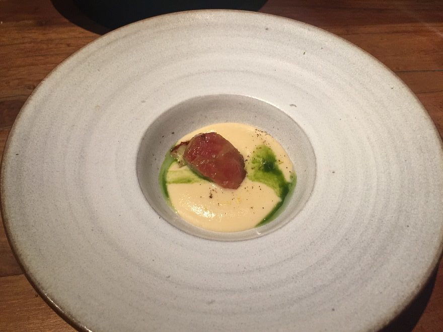 El primero de los principales vino desdoblado en callos del besugo (vejiga natatoria) con crema de kimchi, jugos de las cabezas, crema de berenjena ahumada, espinas encevichadas.