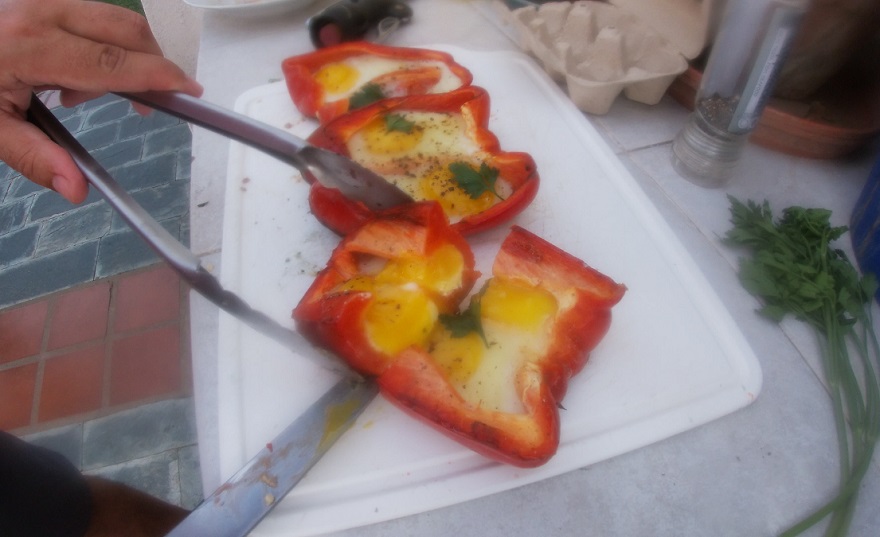 Pasado unos minutos ya tenemos lista nuestra guarnición para el asado. Lo ideal es siempre que hacemos morrón relleno con huevo seguir bien de cerca la cocción para asegurarnos de que nos quede la yema un tanto líquida.