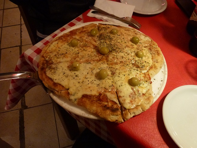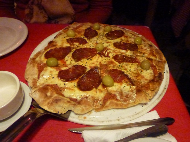 En mi primer visita a Napoli Trattoria & Café probé las pastas con su correspondiente vino en pingüino ($50) por lo que en esta ocasión me incliné por las pizzas. Tras agrandarse la mesa sobre la marcha nos vimos obligados a probar dos pizzas, Calabreza ($125) y Cuatro Quesos ($125). Ambas muy buenas y de generoso tamaño. La bebida esta vez no fue vino sino cerveza, Imperial en mi caso, que el mozo que nos atendió fue a buscar personalmente al quiosco del frente y luego guardó en su heladera para mantenerla fría, al parece esta es una práctica habitual en el lugar porque lo hizo con natural displicencia.