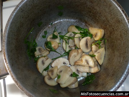 …una vez que comiencen a ablandarse, agregamos unas hojitas de perejil y apagamos el fuego. Es importante no dejar mucho tiempo los hongos porque al estar compuestos de agua pierden su textura con el calor.