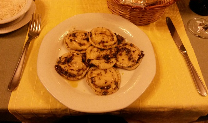 Pedí Sorrentinos de ricotta y nuez con salsa Sette aromi (pesto) ($101) y un vino de la casa que si mal no recuerdo era un Estancia Mendoza y a un costo de unos $55 o algo así, no retuve el precio pero recuerdo que era muy barato.