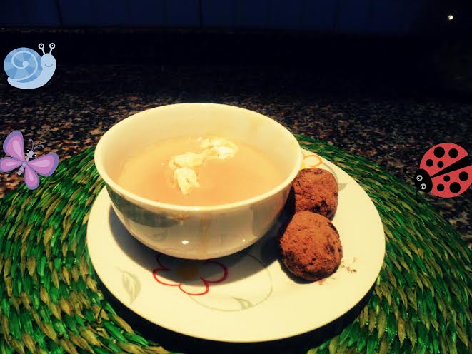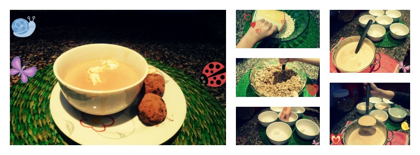 Para cerrar la tarde, merendamos una compotera llena de postre de dulce de leche y merenguitos, acompañada por bombones que nos darán nutrientes y energía.