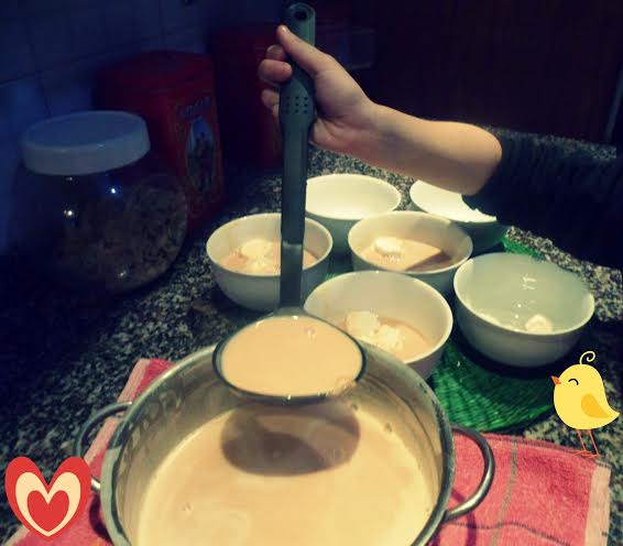 Es el momento de preparar el postre de leche, sencillo y divertido, hervir la leche con el polvo instantáneo, revolviendo rápidamente con cuchara de madera -esto lo hacen los adultos, papás, tíos piolas- para que no se formen grumos. Dejar hervir 2 minutos, revolviendo continuamente; cuando adquiere consistencia cremosa está listo.