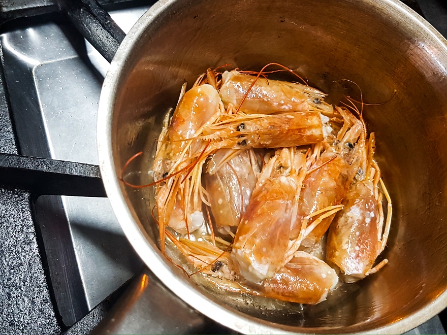 Comenzamos por la Leche de tigre para la que se pone a saltear una cabeza de langostino por persona. Luego se agrega un poco de agua.