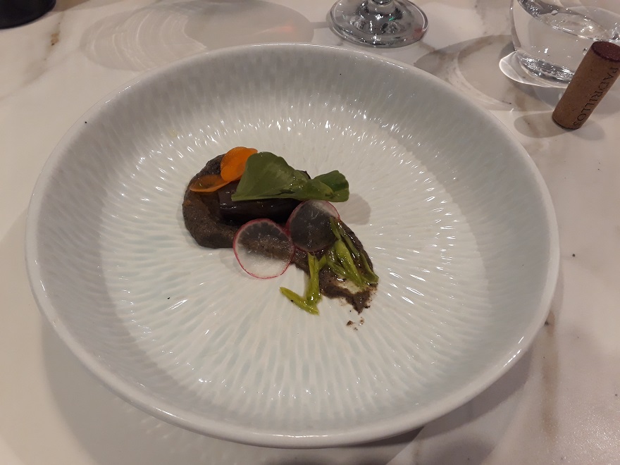 Appetizer: Berenjenas en dos texturas, una crema asada y otra especiada. Una gentileza de la casa que ya predispone bien al comensal para lo que sigue.