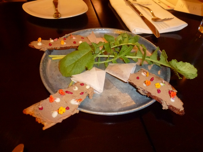 Al llegar al restaurante mientras nos acomodamos para leer las cartas, tanto la de platos como la de vinos para la que recibieron el asesoramiento de Marcelo Pelleriti, montan el servicio y dejan una manteca de ajo quemado [o algo así] con pancitos recién elaborados. Acto seguido llega el momento de un snack: busquetas de pan de masa madre con paté de conejo. Para acompañar pedí un Vallisto malbec, vino que ya conocía por haber participado de un almuerzo de presentación junto a Pancho Lavaque hace poco meses.