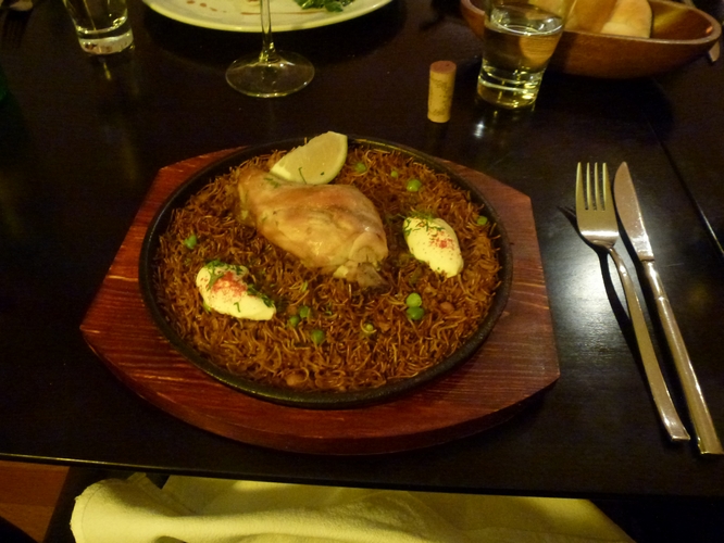 El principal fue Fideuá de conejo con alioli. Una adaptación con fideos cabellos de ángel del tradicional plato valenciano que estuvo muy bien e hizo recuperar la senda ascendente. Este plato por su carga de sabores, el tan preciado socarrado y presentación colaboró a empujar la vara nuevamente para arriba.
